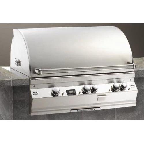 This Fire Magic Gas Grill features sleek styling with seamless control panel, double-walled tear-drop hood with warming rack, 110v hard wired electrical supply which powers the 12 volt electric hot surface ignition system with flash tubes, angled halogen internal oven lamps, and 4-zone backlit digital meat and grill thermometer in control panel. Also features a wood chip smoker drawer with dedicated burner, heat zone separators, feather lite easy lift hood, industry exclusive cast stainless E burner, stainless rod cooking grids, stainless valve manifold, polished Comfort Touch control knobs, disposable foil drip tray liners and water and rain resistant construction. Comes ready to be built in to your island opening. 1 Factory-Installed Infrared Burner (on left side) and 2 Cast Stainless Steel E Burners. 792 square inches of cooking surface (36 x 22 main grilling area). Includes 23,000 BTU backburner and rotis kit. Island cut-out dimensions: 37 width x 23. 5 depth x 12 height. No hose and/or regulator assembly included.